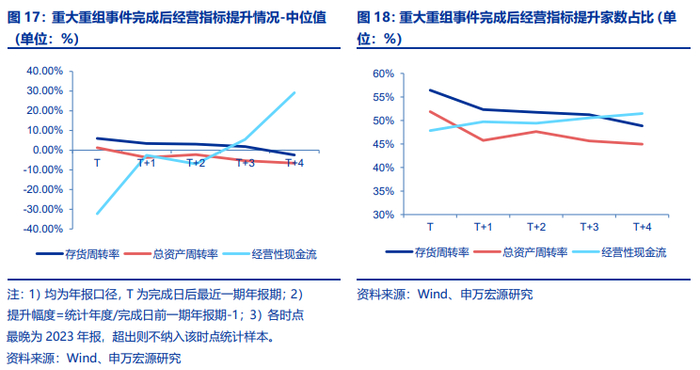 从完成日后几年经营指标的变化情况看,以完成日前一年报期为比较基准,存货周转率、总资产周转率在完成日当年有所提升,提升家数占比分别为56%、52%,但自完成日后第二年起增速收窄,甚至出现下滑,完成日后第五年的提升幅度、提升家数占比均降至谷值。经营性现金流在收购完成后当年、第二年及第三年下滑,但自第四年起相较于完成日前出现提升,提升家数占比也升至51%。