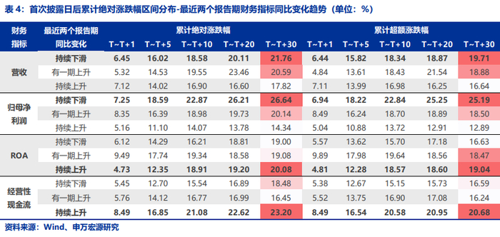 在财务指标上,最近两个报告期营收、归母净利同比持续下滑的上市公司反而公告日效应更强,累计绝对、超额涨跌幅及上涨家数均高于其余区间,其中归母净利领先幅度更大;ROA、经营性现金流同比持续提升的上市公司在首次披露日后股价表现更佳,但ROA各区间差异较小。