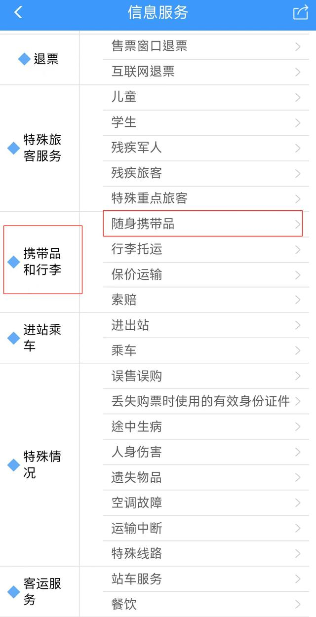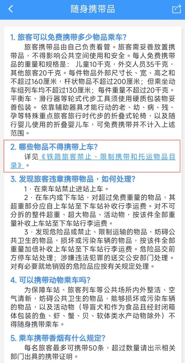 针对更多携带品和行李详情,旅客可以在12306网站、12306App上自行查询,提前做好出行规划。