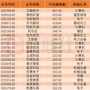 根据Choice数据统计,自9月18日以来,北交所涨幅排名前二十的公司依次为:艾融软件、铜冠矿建、华岭股份、天马新材、恒拓开源、利尔达、佳先股份、艾能聚、华信永道、联迪信息、晶赛科技、众诚科技、同辉信息、慧为智能、星辰科技、同惠电子、流金科技、云里物里、海泰新能、凯德石英。