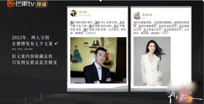 节目中,两人也透露,2022年七夕时两人就彻底分开过。黄圣依和杨子以藏头文字的方式发布微博,黄圣依的言论为:岁月如歌,各自安好,杨子的则为:相见不如怀念。