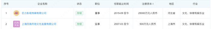 杨子与黄圣依共同持股、仍存续的企业共两家,分别为巨力影视有限公司和上海四海天地文化发展有限公司。其中巨力影视由杨子出任总裁,黄圣依出任执行总裁,两人分别持股30%、10%。