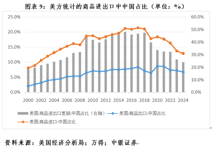 据美方统计,2017年(中美经贸摩擦升级前夕),美国商品出口、进口和进出口差额中,中国占比分别为8.3%、21.4%、46.9%,2020年降至分别为8.7%、13.4%、33.7%,2024年前8个月进一步降至分别为6.7%、12.9%、24.0%(见图表9)。中国外贸进出口能够在“小院高墙”“脱钩断链”的打压遏制下取得上述成绩,实属不易。