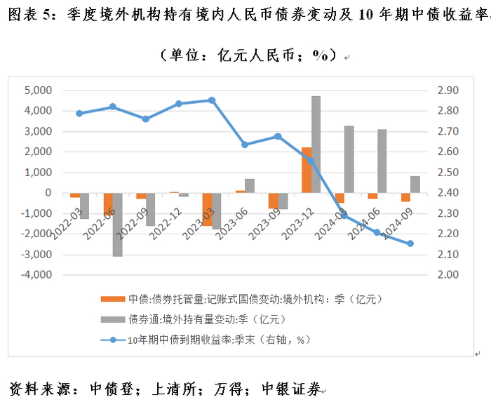 2023年三季度至2024年二季度,以人民币计值的全球人民币储备规模累计下降了3675亿元。然而,鉴于同期中债收益率震荡下行(10年期中债收益率由2021年底的2.78%降至2024年6月底的2.21%),境外储备经营机构减持的人民币资产应超过了前述规模。值得一提的是,2023年三季度至2024年二季度,各季境外持有人民币储备规模分别下降810亿、400亿、773亿和24亿元。这表明境外人民币储备经营机构未参与2023年9月至2024年6月外资持续增持境内人民币债券资产的行动。境内记账式人民币国债是境外人民币储备资产配置的主力品种。债券通的统计数据显示,2023年三季度至2024年二季度间,境外机构记账式国债托管量累计增加673亿元,仅贡献了同期外资净增持境内人民币债券10323亿元的6.5%(见图表5)。