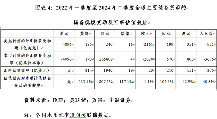 根据美国财政部国际资本流动报告(TIC)数据,2022年初至2024年6月,外资官方持有美债余额累计减少2907亿美元。其中,交易引起的减少额为198亿美元,贡献了6.8%;美债收益率上行(同期10年期美债收益率由1.52%升至4.36%,上升了284个基点)、美债价格下跌引起的负估值效应2704亿美元,贡献了93.2%(见图表2)。当然,若外资官方持有的外汇储备配置到美股上,当期将录得美股上涨带来的正估值效应,只是买卖股票对于外汇储备经营来讲属于浅尝辄止的另类投资,占比不高、贡献有限。