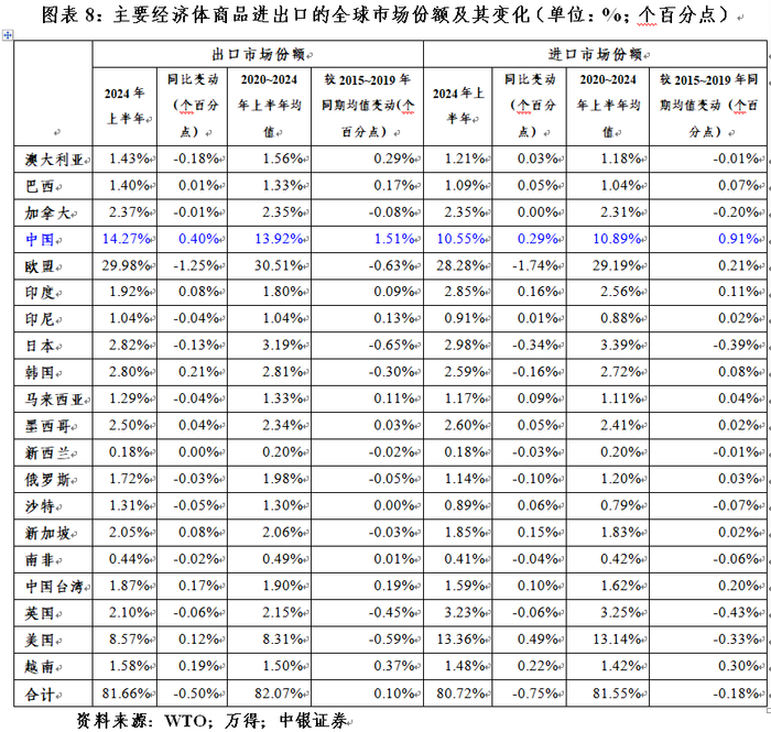 2024年上半年,中国出口市场份额同比增幅在主要经济体中名列前茅。同期,美国出口份额仅上升了0.12个百分点。受益于近岸贸易、友岸外包的韩国、越南、中国台湾、印度、墨西哥、巴西分别上升了0.21、0.19、0.17、0.08、0.04和0.01个百分点,欧盟、澳大利亚、日本、英国、印尼和加拿大则分别下降1.25、0.18、0.13、0.06、0.04和0.01个百分点(见图表8)。