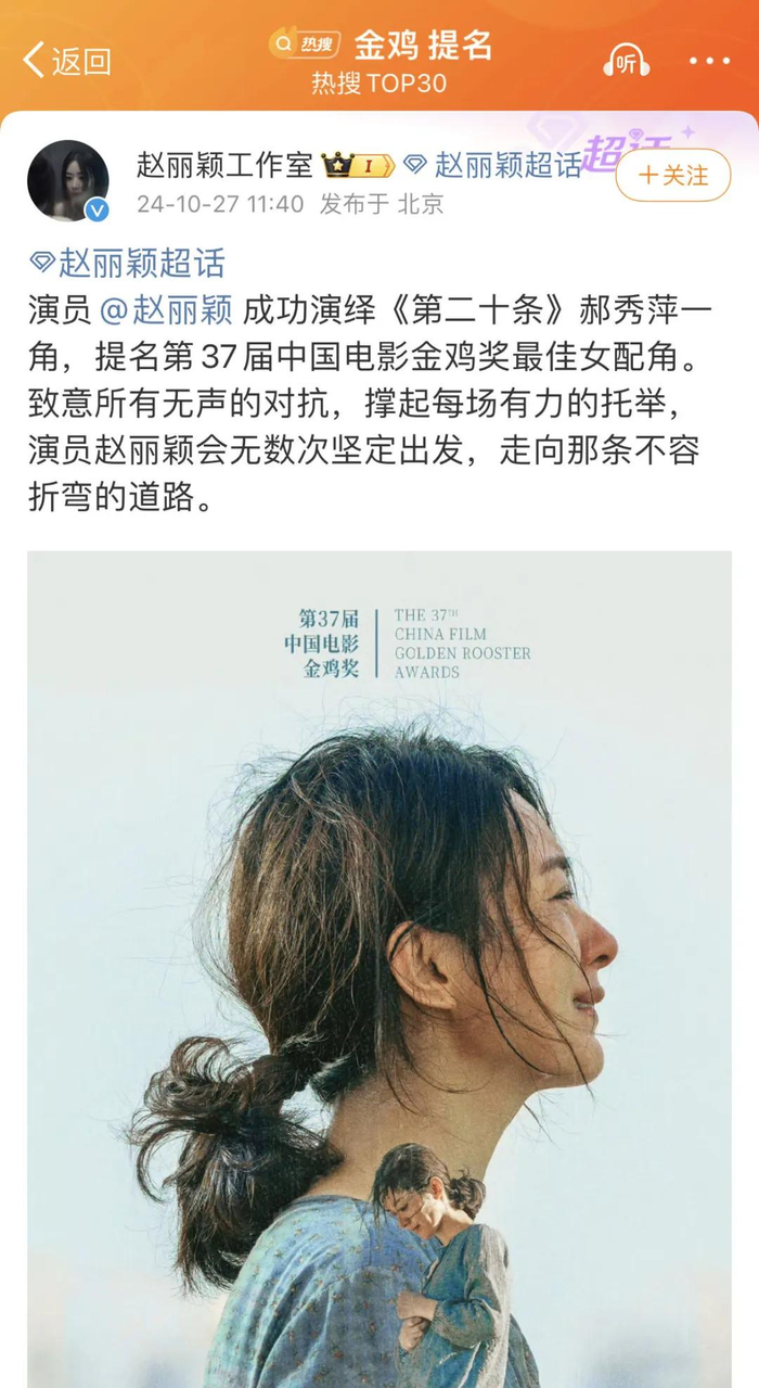 10月27日,第37届中国电影金鸡奖评委会提名名单公布,赵丽颖凭电影《第二十条》郝秀萍一角提名最佳女配角,这也是她首次获得金鸡奖提名。