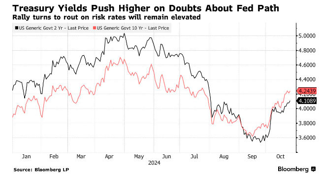 在过去的一个月里,美债价格已经大幅下跌,因为美国经济的持续走强愈发令人怀疑美联储是否还能在未来几个月里持续降息。美国大选的日益临近也增加了市场的不确定性,一些投资者猜测一旦特朗普获胜将大幅推高美债收益率,因为他们其致力于推行的企业减税和关税政策将加剧通胀压力,并最终可能使利率维持在高位。