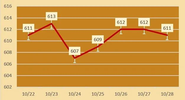 今日黄金回收价格每克611元,铂金回收价格每克204元,钯金回收价格每克227元,18K金回收价格每克436元,白银回收价格每克5.7元。(黄金行情是波动的,以结算价格为准。)