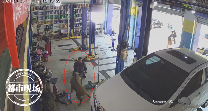 据视频显示,野猪闯入了进贤县云桥路上的一家汽修店,造成店里一名小伙子受伤。汽修店工作人员龚先生见状立即报了警。