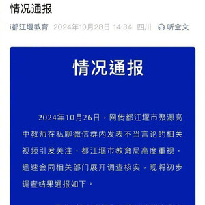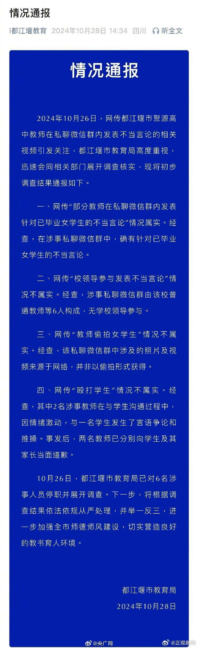 10月28日,“i都江堰教育”公众号发布情况通报:2024年10月26日,网传都江堰市聚源高中教师在私聊微信群内发表不当言论的相关视频引发关注,都江堰市教育局高度重视,迅速会同相关部门展开调查核实,现将初步调查结果通报如下。一、网传“部分教师在私聊微信群内发表针对已毕业女学生的不当言论”情况属实。经查,在涉事私聊微信群中,确有针对已毕业女学生的不当言论。二、网传“校领导参与发表不当言论”情况不属实。经查,涉事私聊微信群由该校普通教师等6人构成,无学校领导参与。三、网传“教师偷拍女学生”情况不属实。经查,该私聊微信群中涉及的照片及视频来源于网络,并非以偷拍形式获得。四、网传“殴打学生”情况不属实。经查,其中2名涉事教师在与学生沟通过程中,因情绪激动,与一名学生发生了言语争论和推搡。事发后,两名教师已分别向学生及其家长当面道歉。10月26日,都江堰市教育局已对6名涉事人员停职并展开调查。下一步,将根据调查结果依法依规从严处理,并举一反三,进一步加强全市师德师风建设,切实营造良好的教书育人环境。