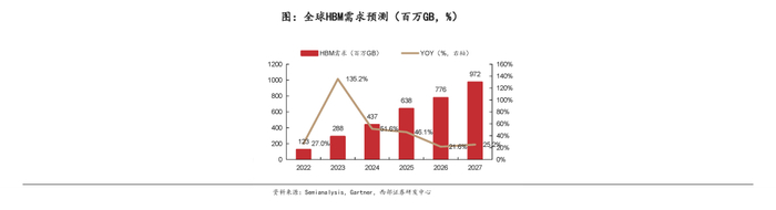 根据Gartner,2027年全球HBM市场收入有望达到52亿美元,2022-2027年CAGR为36.3%;2027年全球HBM市场需求有望达到9.72亿GB,2022-2027年CAGR为51.3%。