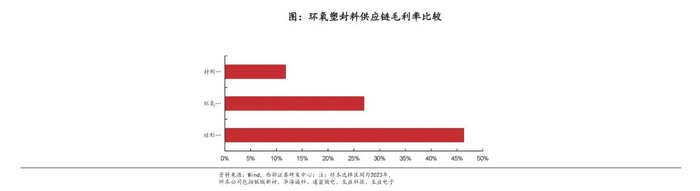 环氧塑封料供应链:硅微粉>环氧塑封料>封测。分别选取联瑞新材球形粉毛利率、华海诚科毛利率、通富微电毛利率分别指代球形硅微粉、环氧塑封料、封测三个环节。综上可见,高壁垒加持下,电子级硅微粉在供应链中具备较高毛利率水平。