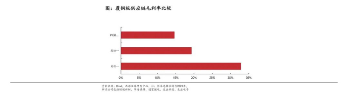 覆铜板供应链:硅微粉>覆铜板>PCB。分别选取联瑞新材角形粉毛利率、生益科技毛利率、生益电子毛利率指代角形硅微粉、覆铜板、PCB三个环节。