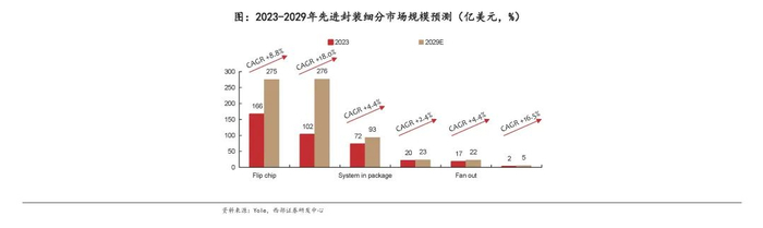 先进封装是封装市场增长主驱动力,2023-2029年CAGR预计为12.7%。伴随制程技术接近物理极限,芯片性能提升难度加剧,因此产业也将目光投向先进封装技术,通过创新封装手段实现芯片更紧密集成,优化电气连接,满足当前人工智能、高性能计算技术快发展对芯片性能的要求。2023年半导体产业整体较为疲软,先进封装亦受影响,但整体受益AI、HPC等趋势推动,未来有望实现较高增长。根据Yole,2029年全球先进封装市场规模有望从2023年的390亿美元增长至800亿美元,期间CAGR有望达到12.7%。