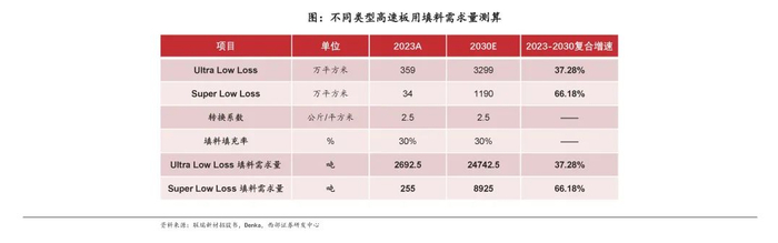 我们认为高速板用高端粉体市场是容易被忽视的高景气快发展细分市场,根据Denka预测,2030年Ultra Low Loss、Super Low Loss高速板需求分别有望达到3299、1190万平方米,我们据此测算到2030年Ultra Low Loss、Super Low Loss高速板用填料需求量分别为2.5万吨、8925吨,2023-2030年CAGR为37.28%、66.18%。