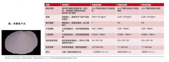 常规覆铜板填充初级硅微粉,高端覆铜板对硅微粉各项性能要求提高。普通覆铜板一般用角形硅微粉即可,主要起到降成本作用,部分熔融粉具备较好的性能。如高频高速、HDI基板等较高技术等级的覆铜板一般都采用经改性后的高性能球形硅微粉(通常中位粒径3um以下)。