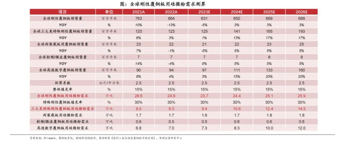 我们测算到2026年全球刚性覆铜板用硅微粉需求为25.9万吨,其中普通板用硅微粉需求为11.4万吨,三大类特殊板硅微粉需求为14.5万吨,高端需求或超半数;在三大类特殊板中,以高速板体量最大,预计为12万吨,封装载板和射频/微波板分别为1.8、0.6万吨。