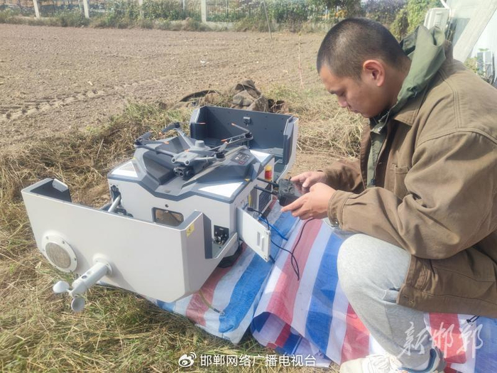 在邱县古城营镇东杜林疃村近800亩小麦实验田的工作站里,科研团队驻守人员、计算机应用技术方向的研究生苏皓正在把一台低空监测巡检无人机安置在俗称“机场”的起飞平台上。启动“机场”功能后,他径直回到装有监测总控系统的电脑前,轻轻敲下“起飞”指令,无人机“嗖”的一声,从“机场”腾空而起,直冲天际……