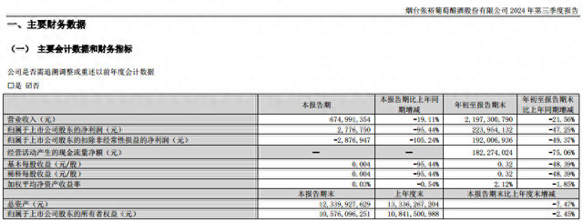 报告期内,张裕A实现营业收入21.97亿元,同比下降21.56%;归母净利润2.24亿元,同比下降47.25%;扣非归母净利润1.92亿元,同比下降49.37%;基本每股收益0.32元。