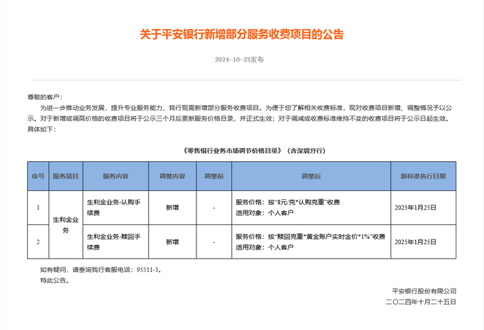 在公告中,平安银行表示,为进一步推动业务发展,提升专业服务能力,我行现需新增部分服务收费项目。为便于您了解相关收费标准,现对收费项目新增、调整情况予以公示。对于新增或调高价格的收费项目将于公示三个月后更新服务价格目录,并正式生效;对于调减或收费标准维持不变的收费项目将于公示日起生效。具体为:生利金业务新增认购手续费的服务价格:按“8元/克*、认购克重”收费,适用对象为个人客户。生利金业务-赎回手续费的服务价格:按“赎回克重*黄金账户实时金价*1%”收费、适用对象为个人客户。