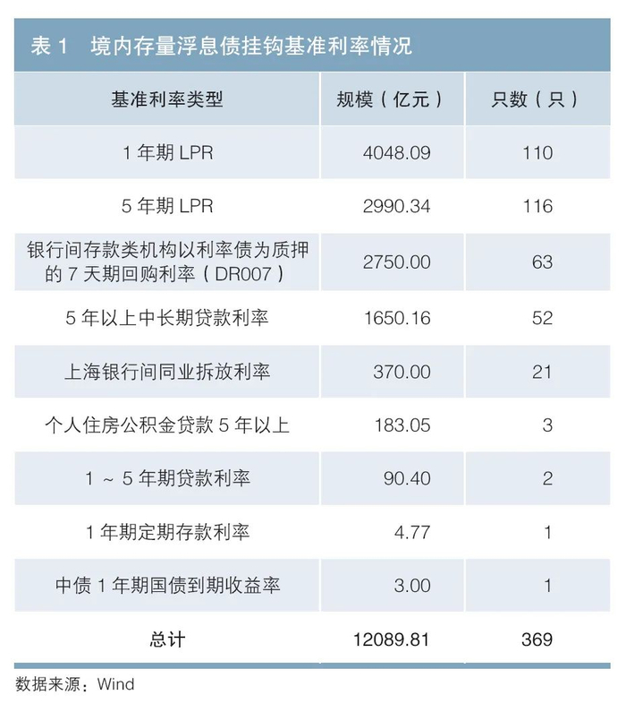 境内浮息债存量结构中,政策性金融债规模占比约为55.91%,资产支持类债券规模占比约为41.08%,而普通信用债规模占比仅约为3.01%(见图2)。从基准利率来看,以1年期贷款市场报价利率(LPR)为基准的浮息债规模最大,约为4048.09亿元,约占全部浮息债规模的33.48%;其次是以5年期LPR为基准的浮息债规模约为2990.34亿元,约占全部浮息债规模的24.73%(见表1)。