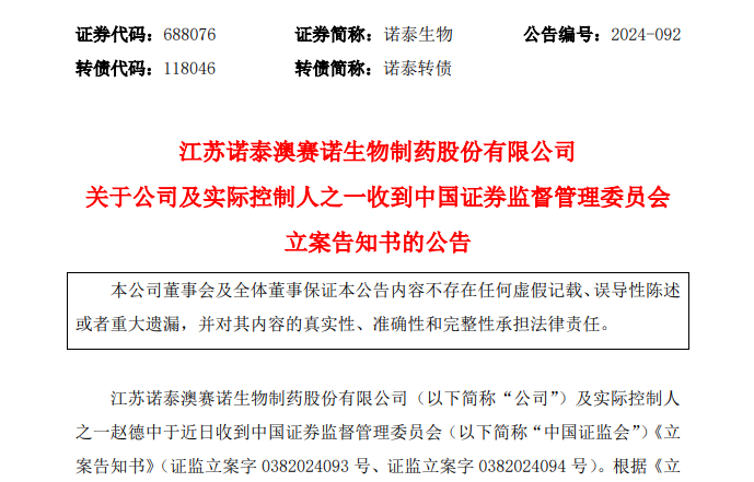 近日,江苏诺泰澳赛诺生物制药股份有限公司(下称“诺泰生物”)发布公告称,因涉嫌信息披露违法违规,公司及实际控制人之一赵德中于近日收到中国证监会的《立案告知书》。诺泰生物在公告中披露,经自查,其认为此次立案可能涉及诺泰生物2021年度技术转让相关事宜。