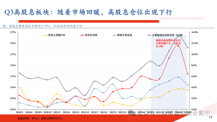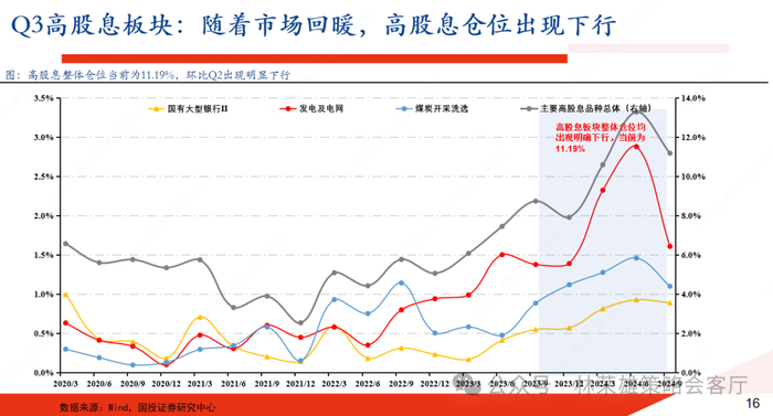 从目前Q3机构持仓来看,主要高股息品种持仓回落至11.19%,其中电力及公用事业减仓最为明显,煤炭与石油石化也被不同程度减仓。