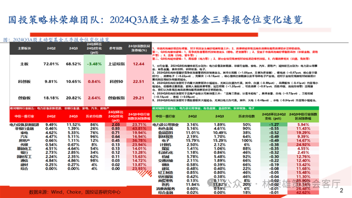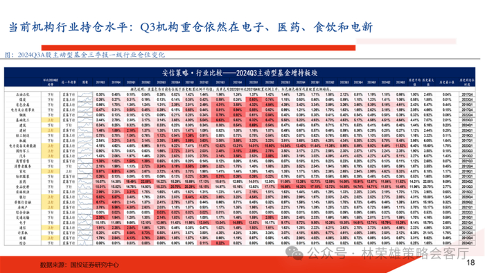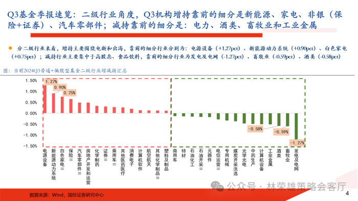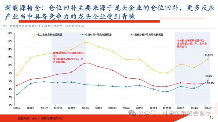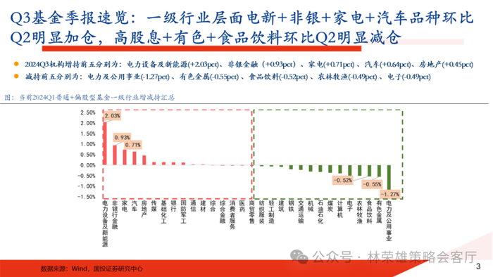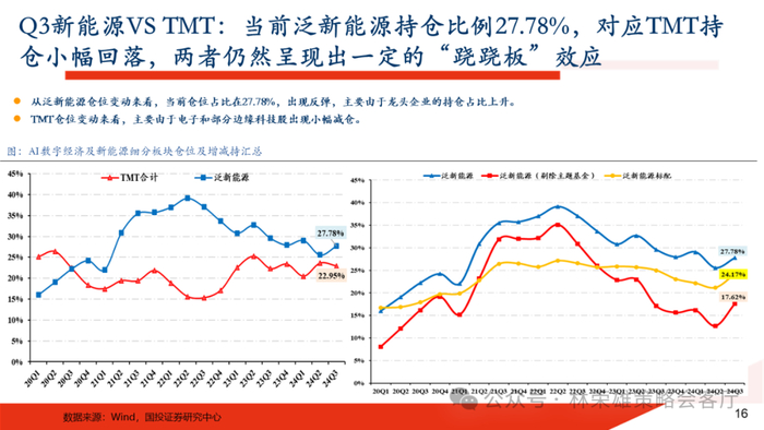 1、新能源和TMT板块的跷跷板效应依然明显:Q3机构增持竞争优势显著的新能源制造龙头企业。例如太阳能(+1.08pct,主要为逆变器)、锂电池(+0.87pct,核心是宁德时代),围绕泛新能源出现仓位回补,目前泛新能源持仓回升至27.78%,剔除掉主题型基金则回升至17.62%,对应TMT持仓则回落至22.95%。目前看,除少数龙头企业之外,新能源领域其他领域仓位变化并不显著,本轮新能源加仓核心我们认为更多是基于逐渐走出产业内卷困境且竞争格局逐渐清晰的部分环节龙头企业。