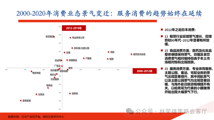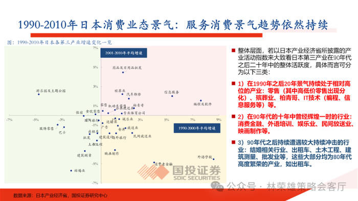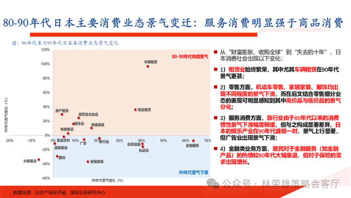 1)上世纪90年代日本服务消费亮点:租赁业、娱乐业、保险业、客运;
