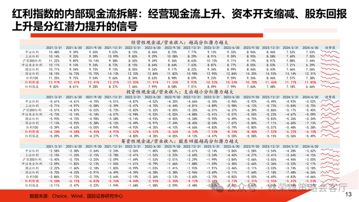 2、能力:自2023Q2开始中证红利指数基本面开始出现下滑,不论是盈利增速还是未来分红潜力都有所削弱,尤其是整体现金持有比例的恶化值得关注。若进一步从最重要的基本面指标:现金流这一角度去观察,会发现表现较好的指数成分多数呈现出经营现金流上升、投资现金流下降、筹资性现金流下降的趋势,往往对应行业竞争格局稳固或者持续改善的背景下企业龙头ROE中枢上移,缩减资本开支,在稳定现金流的商业模式下不断提高现金持有比例,对应分红能力和实际对股东回报的提升,目前看只有红利价值指数的分红能力具备较高保障。