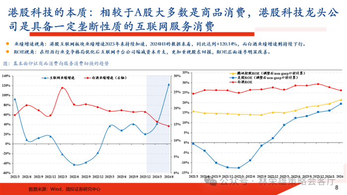 1、港股互联网龙头的本质是服务消费的核心资产:相较于A股大多数是商品消费,港股科技龙头公司是具备一定垄断性质的互联网服务消费。从业绩基本面上来看,当前在商品消费业绩出现困境背景下,服务消费业绩维持高增长。增速层面,港股互联网板块业绩增速2023年来持续加速,2024H1的数据来看,同比达到+120.14%,白酒作为商品消费核心资产的业绩增速则持续下行。ROE视角来看,在经历行业竞争格局优化后互联网平台公司缩减资本开支,更加重视股东回报,ROE层面逐季明显改善。
