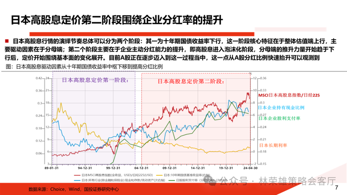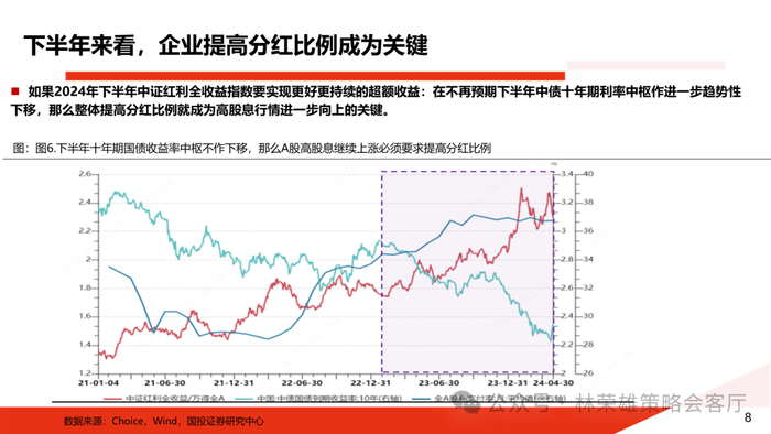 一直以来,我们都在参考日股高股息定价经验:其演绎大致分为两个阶段:1、十年期国债收益率持续下行,对应90年代高股息策略奏效;2、对应2000-2008年日本十年期国债收益率中枢不作下行,但高股息整体受益企业分红持续提升迎来更大一波行情。于是,在5月底中期策略会上,我们鲜明提示:面向下半年,我们认为十年期国债收益率更可能呈现的是上下波动的锯齿状运动,如果中证红利指数维持分红能力削弱或者提高分红空间有限,那么整体策略波段属性将明显上升。
