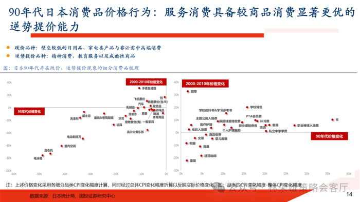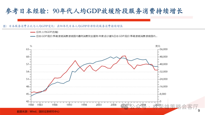 2、参考日本90年代后的产业经验:80年代日本商品消费达到极致,90年代人均GDP放缓阶段服务消费持续增长,服务消费开启30年的景气周期。消费产业核心从此前消费升级过渡到消费理性化,消费理性化包括三个方面:1、服务消费的崛起;2、性价比消费;3、低价消费。相较于商品消费,服务消费在这个阶段体现出更优的逆势提价能力。