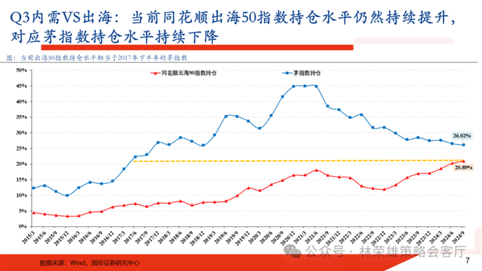 基于基金三季报,我们认为最有价值的切入口在于消费类基金重仓股的变化。可以明确地看到:消费类重仓股减持白酒,同时增持港股互联网和出海方向。对应白酒龙头持仓比例(茅五泸)由9.73%下滑至7.22%,对于美团、腾讯等港股互联网持仓占比快速提升,出海50指数持仓水平提升至20.89%同时作为内需的代表茅指数机构持仓进一步回落至26.02%。