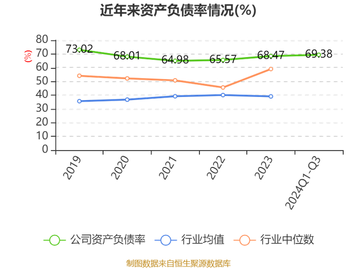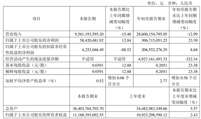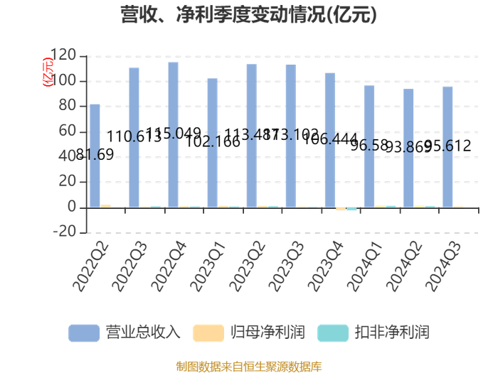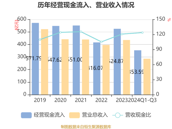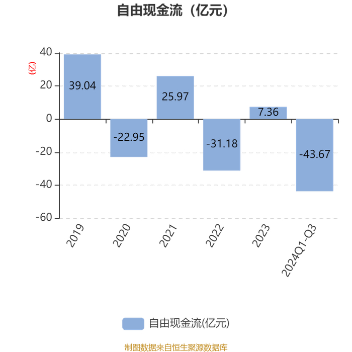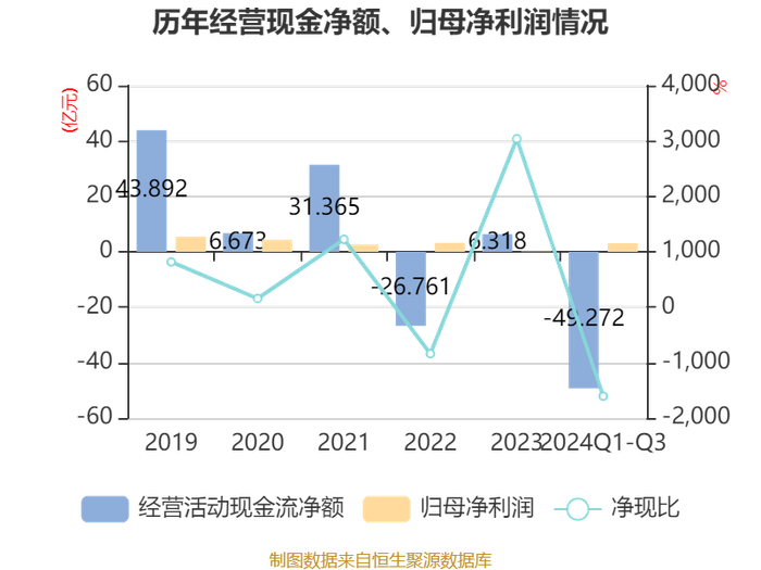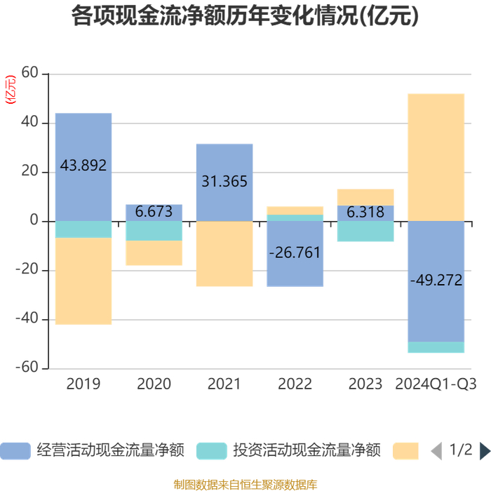2024年前三季度,公司经营活动现金流净额为-49.27亿元,同比减少71.43亿元;筹资活动现金流净额51.82亿元,同比增加55.8亿元;投资活动现金流净额-4.5亿元,上年同期为-6.86亿元。