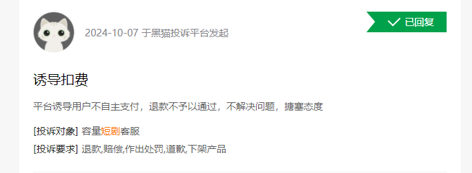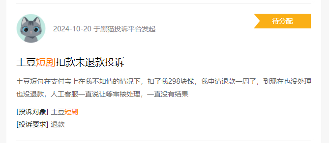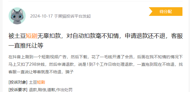 热度逐渐走高的同时,问题也接踵而来。在黑猫投诉平台,搜索“短剧”就有超1700条投诉,包含诱导扣费、自动扣费、宣传不实、难以提现、无法退款等问题,其中土豆短剧更是被高频提起。