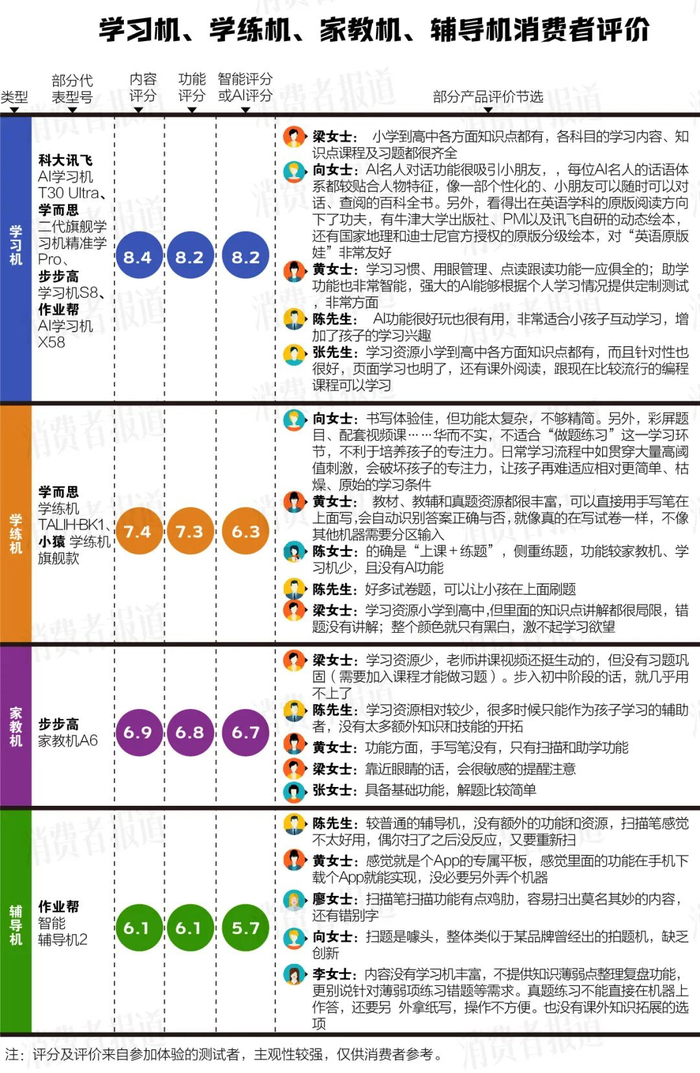 从此次体验的评分来看,学练机、家教机、辅导机虽各有侧重,但在内容、功能和智能或AI评分上未获家长们的整体认可。