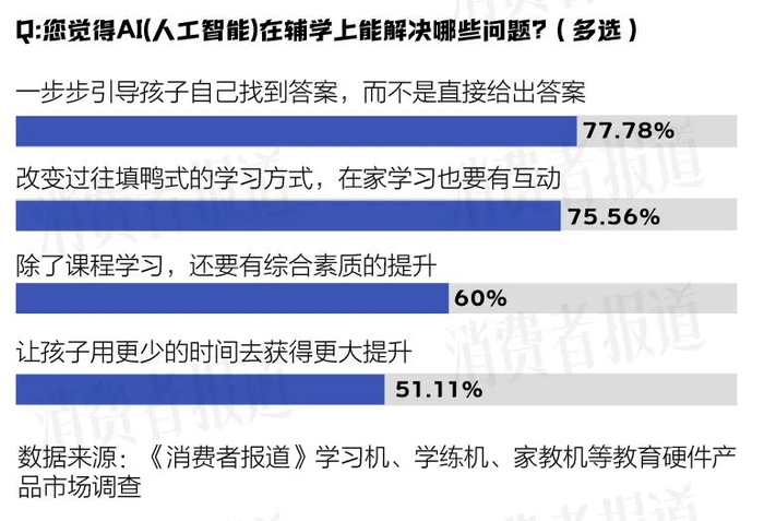 《消费者报道》问卷调研数据显示,在“您期待AI(人工智能)在辅学上能解决哪些问题”上,受访者希望:AI应当因材施教,根据学生的学习习惯、能力和进度提供个性化的学习方案;同时又能有趣且有用地全面激励学生的逻辑能力、创新能力等;能和学生进行智能互动;提升学生的综合素质;足够智能,能一定程度代替家长或老师辅导学业,自我学习,不断进步。