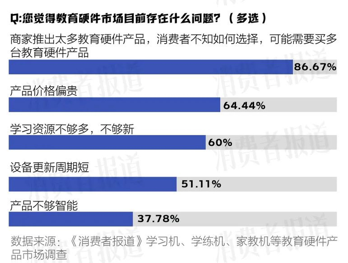 但高速增长也带来不少乱象。《消费者报道》问卷调研数据显示,超过86%受访者表示“商家推出太多教育硬件产品,消费者不知如何选择,可能需要买多台教育硬件产品”。