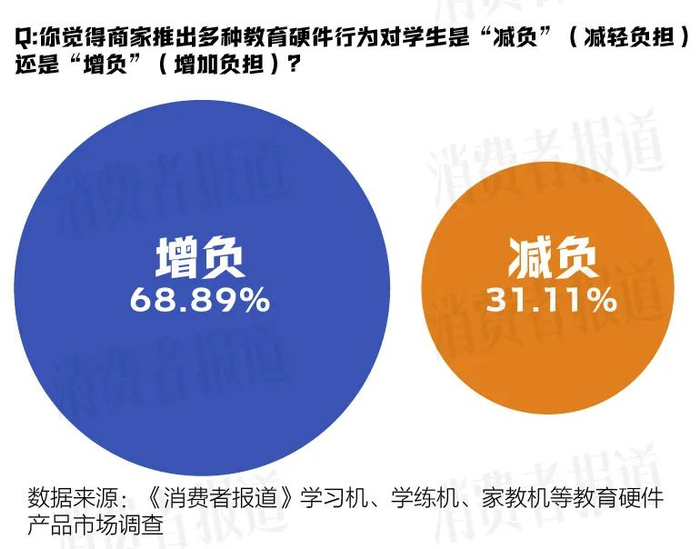 多位受访者对《消费者报道》表示,无论对孩子还是家长来说,购买教育硬件并非“多多益善”。问卷调研数据显示,超过68%受访者表示商家推出多种教育硬件行为对学生是“增负”(增加负担),而不是“减负”。