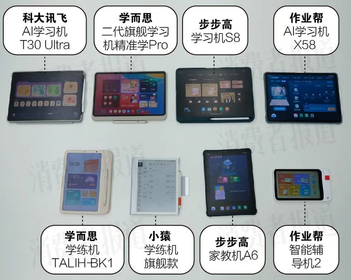 2024年10月,《消费者报道》针对教育硬件市场发起问卷调研,并对市面上销量较佳的8款教育硬件进行了体验测试,包括4款学习机、2款学练机、1款家教机和1款辅导机,涉及学而思、科大讯飞、小猿、作业帮、步步高等品牌。