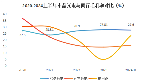 近几年,东田微、五方光电等竞争对手的毛利率均出现大幅波动,甚至还降到10%以下,而水晶光电却保持了逆势增长。
