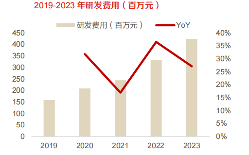 2019-2023年,公司的研发费用从1.6亿增至4.2亿,CAGR高达27%。同时,2023年的研发费用率超8%创下历史新高。