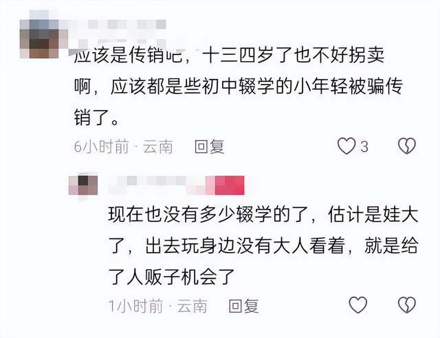 此外,在评论区,有网民表示:“应该是传销吧,十三四岁了,也不好拐卖啊。应该都是一些初中毕业的被骗传销了。”