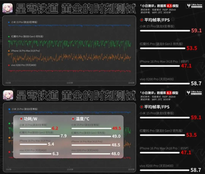 小米15 Pro超高压游戏场景《星穹铁道-黄金的时刻》30分钟测试:平均帧率59.1 FPS,功耗6.2 W,机身最高温度49.5℃。以上基于小白测评数据库4.5模型进行测试,环境温25℃±0.5℃,屏幕亮度350nit,声音75dB,性能模式。