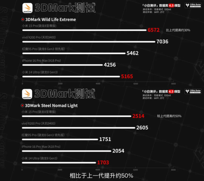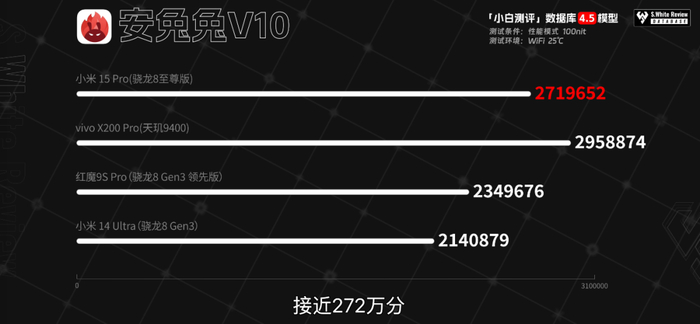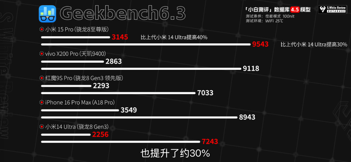 性能表现上,实测小米15 Pro在室温25℃环境下,安兔兔V10综合跑分2719652,Geekbench 6.3单多核3145/9543,3DMark Wild Life Extreme Unlimited 6572分。