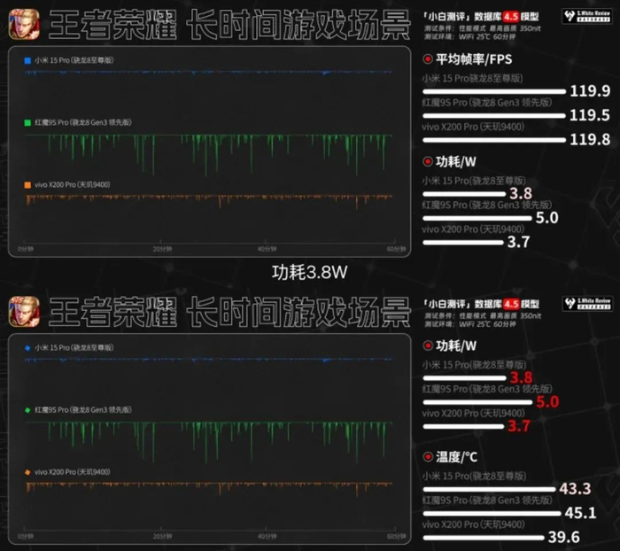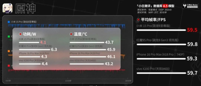 游戏表现上,实测小米15 Pro《王者荣耀》1小时游戏测试平均帧率119.9 FPS,功耗3.8W,机身最高温度43.3 ℃;《原神》30分钟平均帧率59.5FPS,功耗4.1W,机身最高温度43.7℃;