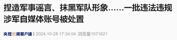 军地相关部门负责人表示,将持续坚决打击自媒体涉军违法违规行为,从严查处发布和炒作不实信息账号主体,曝光典型案例。同时欢迎有关部门和网民积极参与举报,共同打造涉军良好网络环境。