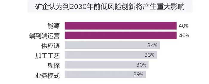 尽管逾半数受访者预计在未来12个月内将加大创新投资力度,仍有多名受访者表示将专注于加工等低风险项目。尽管该行业亟需更多勘探发现,但仅有30%的受访者认为勘探领域创新有可能产生重大影响。